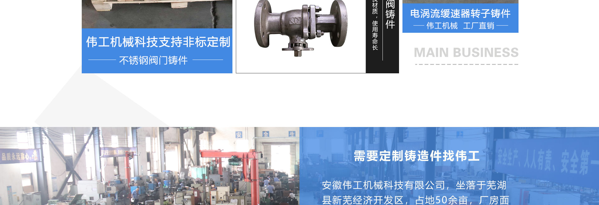 安徽偉工機(jī)械科技有限公司,坐落于安徽蕪湖新蕪經(jīng)濟(jì)開(kāi)發(fā)區(qū),是一家専業(yè)從事鑄造產(chǎn)品設(shè)計(jì)、研發(fā)、生產(chǎn)、銷(xiāo)售于一體的企業(yè),公司為客戶的產(chǎn)品提供多樣的技術(shù)支持與設(shè)計(jì),公司主要鑄造技術(shù)有潮模砂鑄造、硅溶膠精鑄工藝。主要產(chǎn)品有:不銹鋼閥門(mén)配件、泵閥配件、汽車(chē)配件、工業(yè)管道配件、工程機(jī)械配件、汽車(chē)配件等。材質(zhì)為:低合金鋼、304、316、316L、鉻鉬鋼、哈氏合金、碳鋼、雙相鋼等。公司已先后通過(guò)ISO9001和TS16949等多種體系審核,以完備的管理手段和齊全的檢測(cè)設(shè)備滿足客戶需求,進(jìn)的設(shè)備,専業(yè)的技術(shù),嚴(yán)謹(jǐn)?shù)墓芾恚€(wěn)定的質(zhì)量。服務(wù)客戶,鑄造未來(lái),偉工誠(chéng)摯的歡迎新老客戶共同商洽合作
